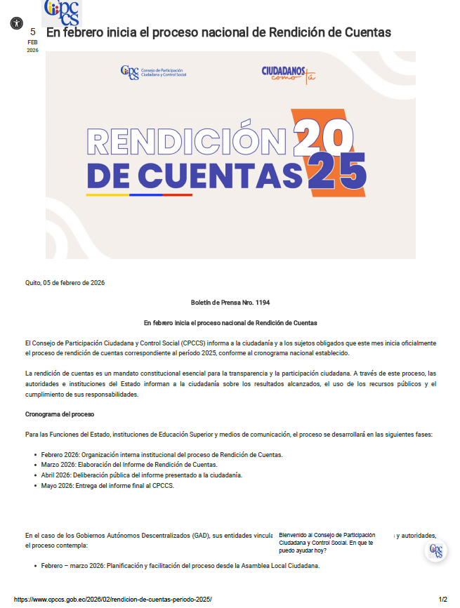 El Consejo de Participación Ciudadana y Control Social – CPCCS- informa que, de acuerdo con lo establecido en el Reglamento de Rendición de Cuentas vigente, el proceso de rendición de cuentas del periodo fiscal 2025 iniciará a partir del mes de febrero 2026 hasta mayo 2026. Este proceso se implementará según lo establecido en el Reglamento y, de forma complementaria, a lo dispuesto en las Guías Metodológicas existentes para cada tipo de sujetos obligados.
